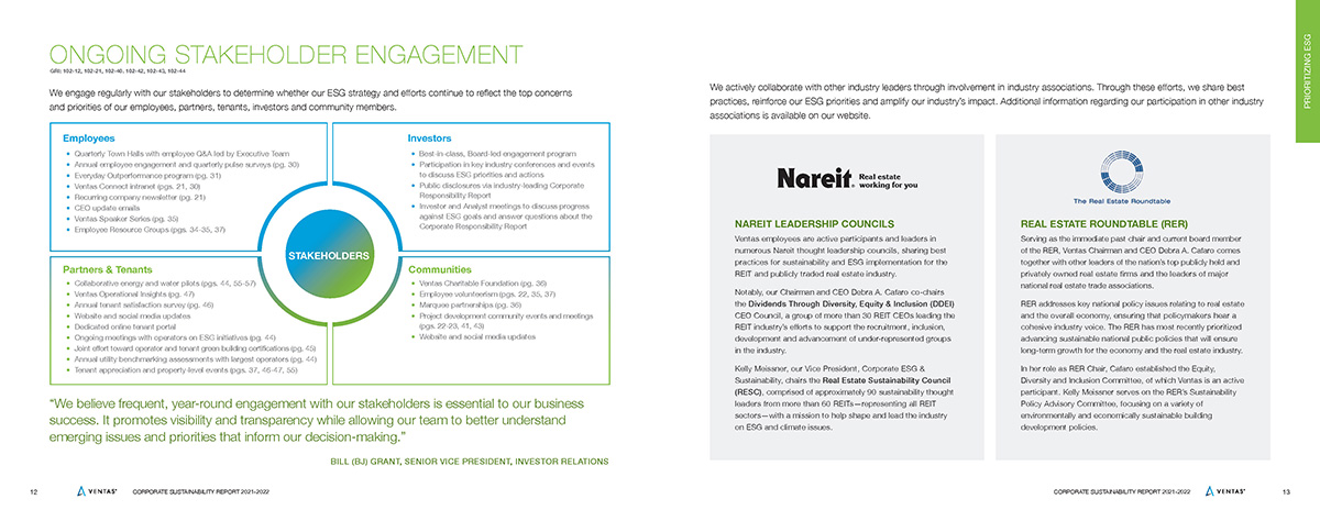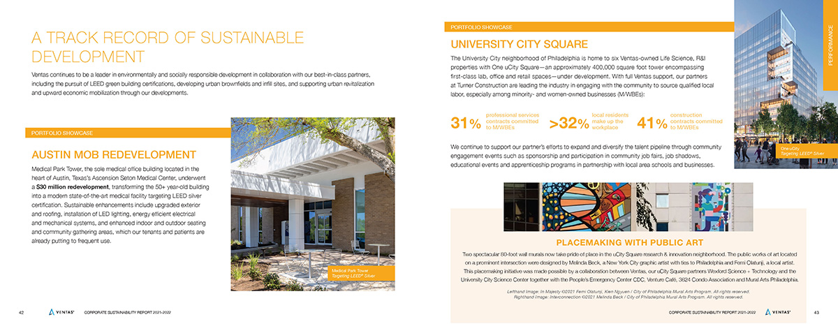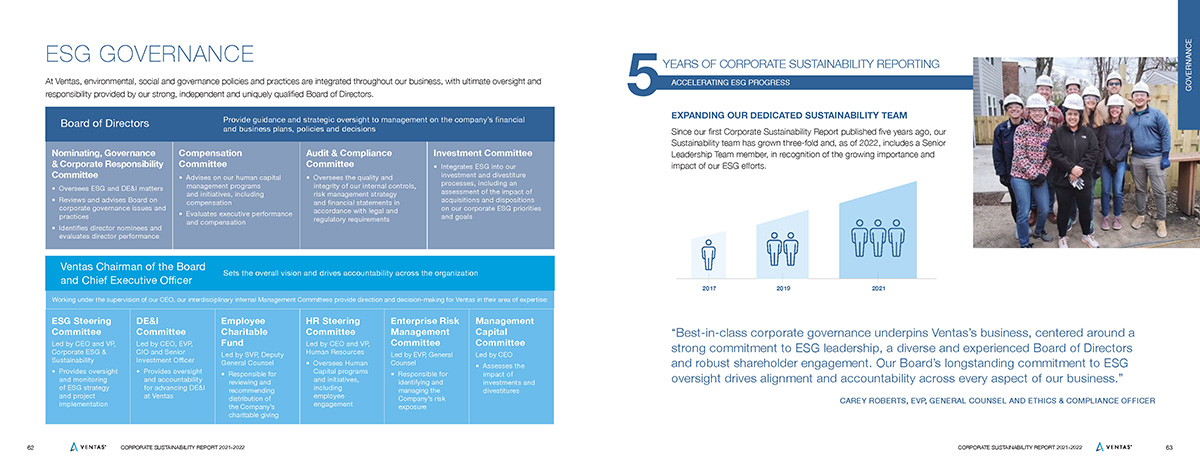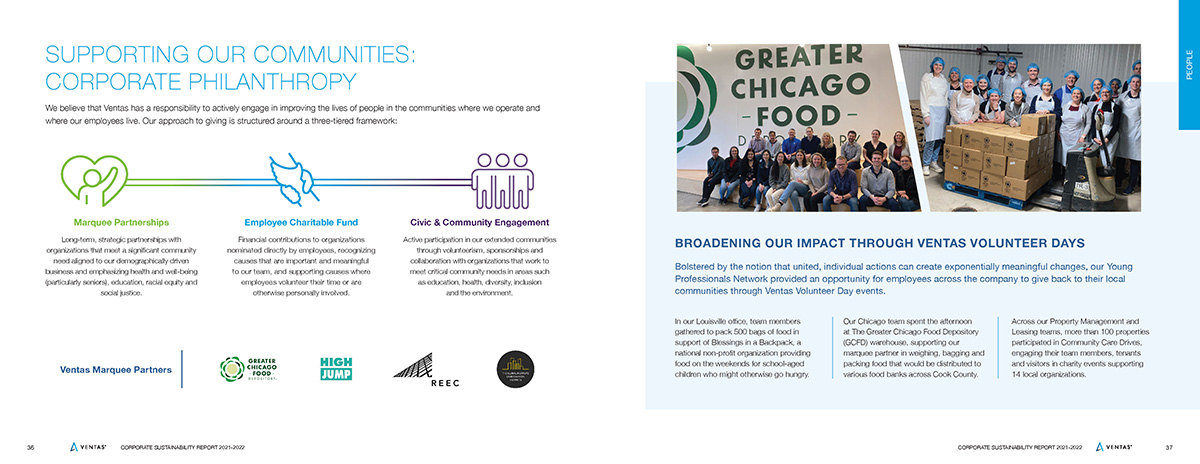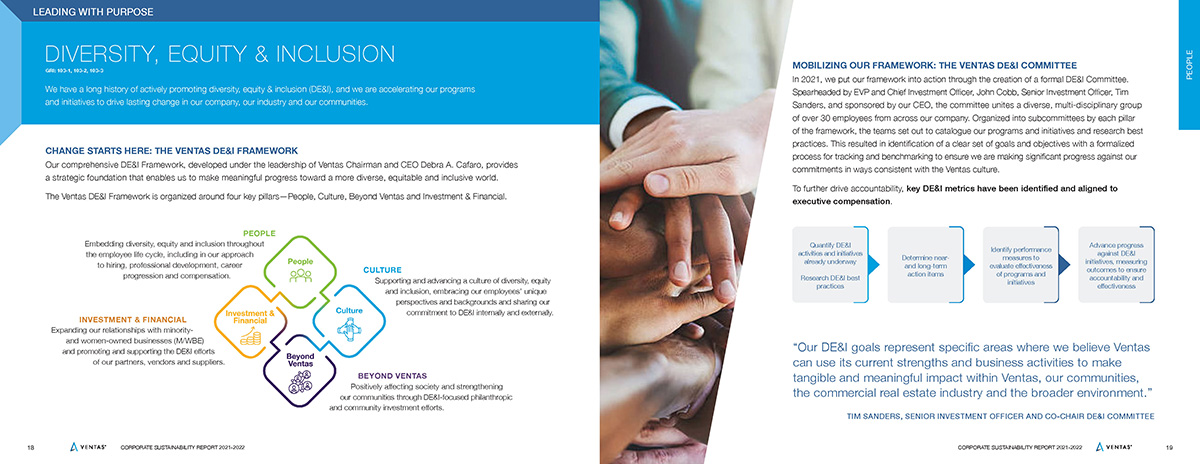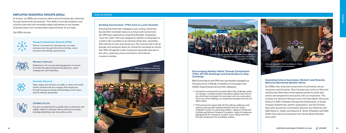 As this was a large project that spanned over a full quarter, I worked closely with other designers to hone in on specific sections. I focused on the People section (pages 9-19), the Performance section (pages 20-24) as well as the Governance section (pages 32-35).